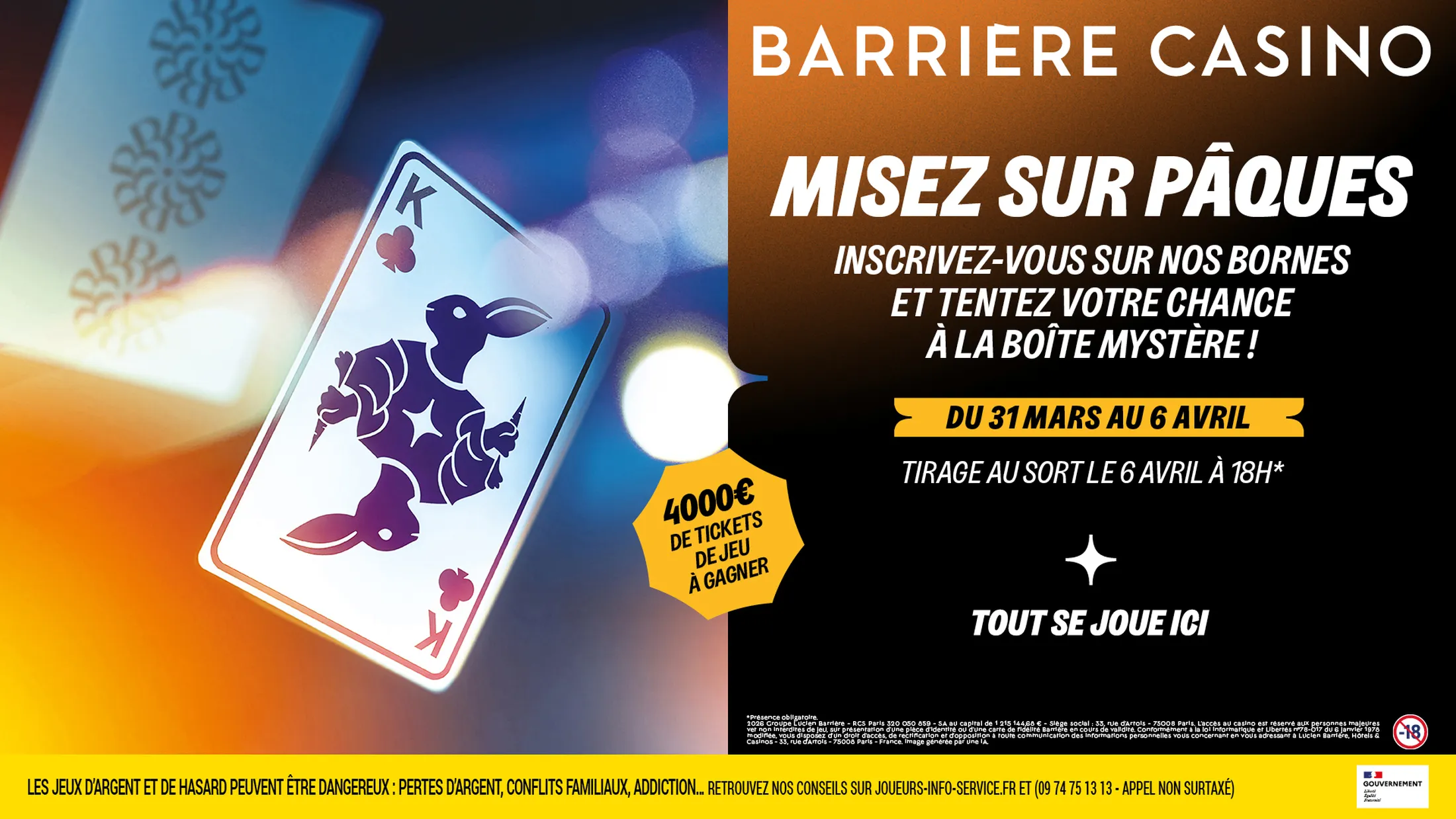 Extrait de règlement : Jeu gratuit du 31 au 6 avril 2026, sans obligation d'achat dans votre Casino Barrière. Règlement de jeu disponible gratuitement à l'accueil du casino.